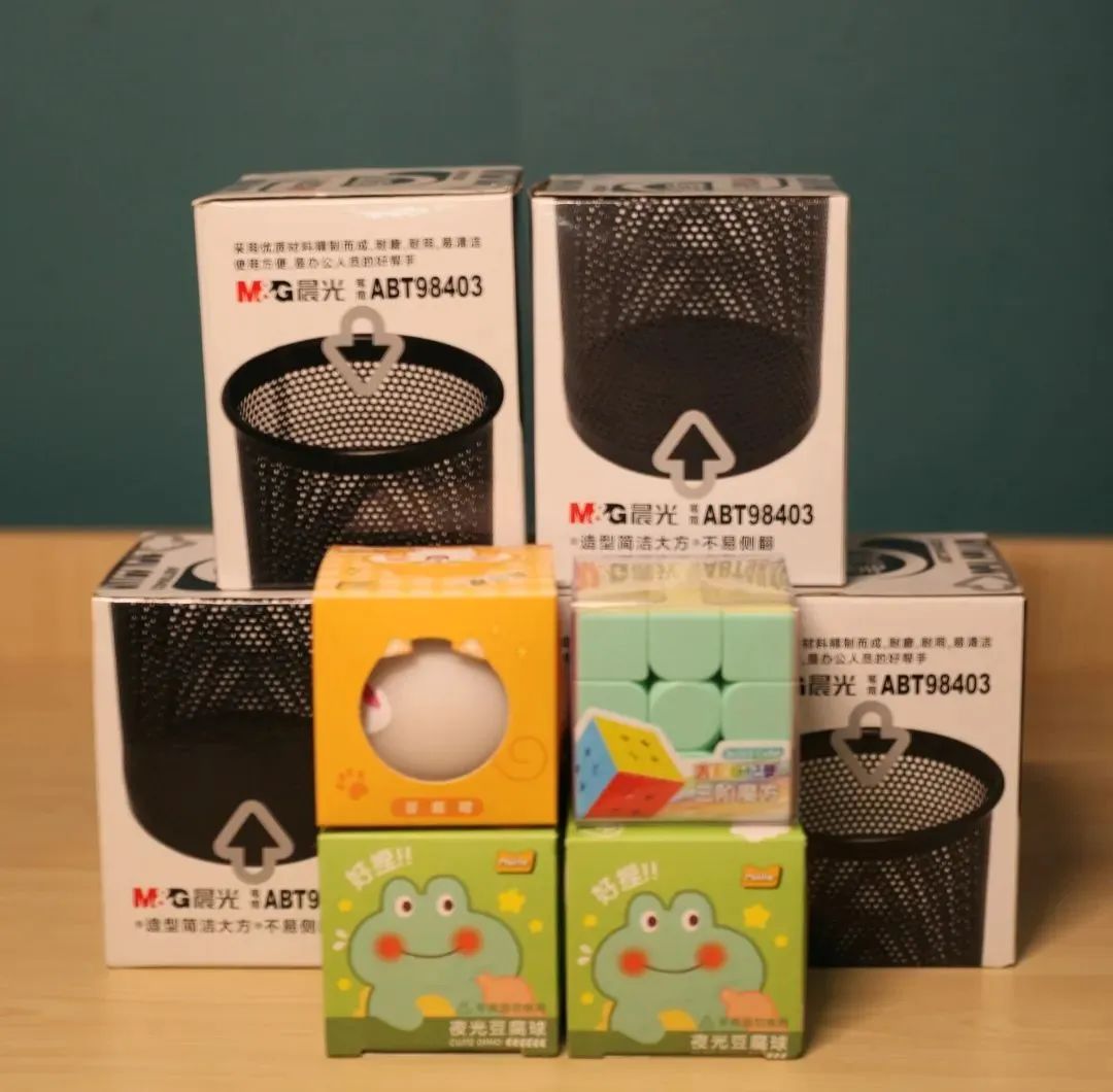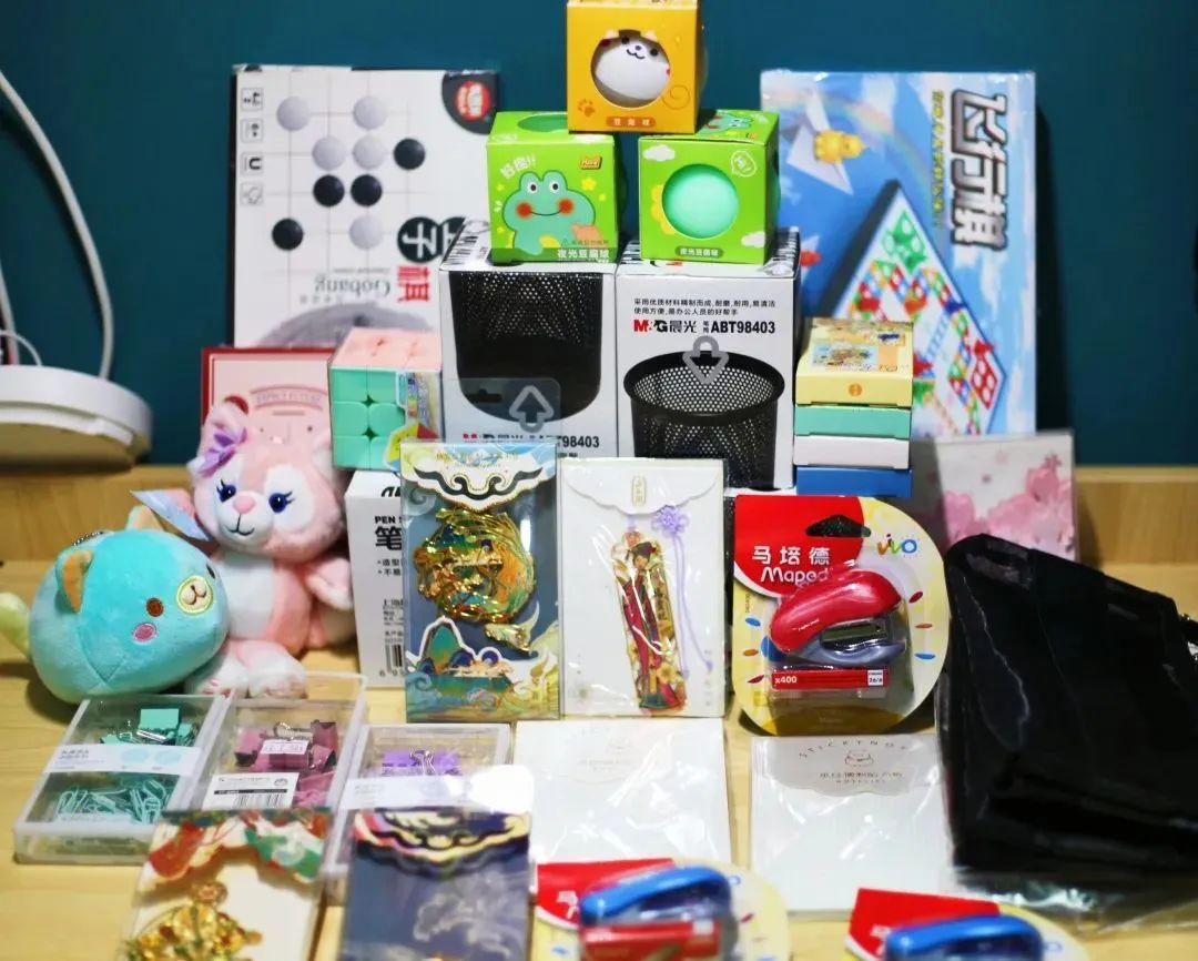 套中即得。奖品有各类书籍、便利贴、精美书签、笔筒、笔袋等学习用品;五子棋、飞行棋等益智用品,还有可爱的毛绒玩具。