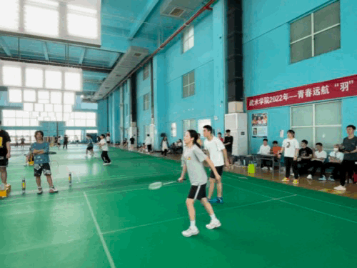 2022年4月24日下午武术学院在小球馆三楼举行“青春远航 ,羽你同行”羽毛球决赛。到场的领导老师有武术学院党委副书记冯婵、21级辅导员刘鹤童以及学生会全体成员。