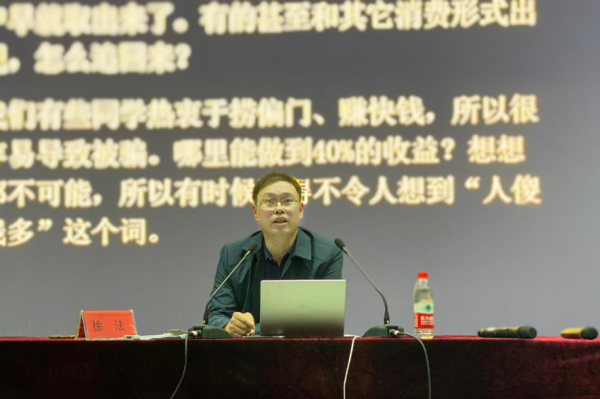 党委书记徐法向同学们重点强调了网络信息安全、电信诈骗、学生纠纷、杜绝校园贷、严禁打架斗殴、严禁吸毒等与校园安全密切相关的问题,并对校园发生的典型案例进行深入剖析,传授学生法律知识和安全防范常识,讲座中他向同学们展示了有关校园安全的视频,视频以贴合当代大学生的趣味脱口秀展示,放松之余同学们也得到了深刻启发。最后他号召同学们自尊、自强、自重、自爱,争做一名尊法、学法、守法、用法的新时代大学生。