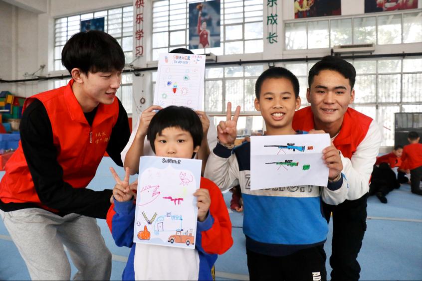 “快乐充实,Go!Go!加油!神锋!神锋!谁与争锋!…”志愿者和小朋友们齐声高呼响亮有力的口号,交流一段时间之后,大小朋友们一起欢歌起舞,一起玩游戏,一起绘制梦想明信片,让体操宝宝们感受到志愿者对他们的热情陪伴,通风一系列团体类的体育游戏,志愿者和小朋友们的关系十分融洽,气氛愉快,笑声连续不断。
