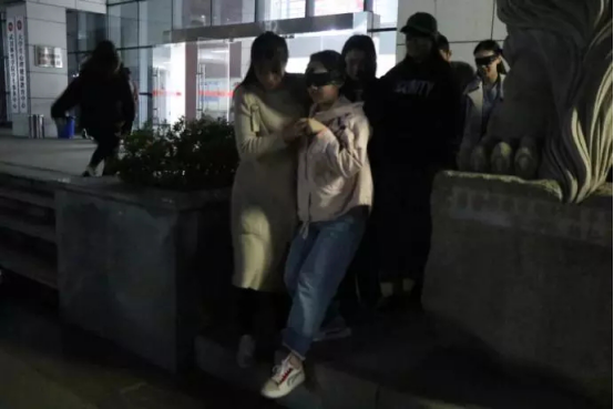 在热身活动结束后,同学们手牵着手开始了一次不同寻常的校园之旅。两个同学组成一组,一位扮演盲人,另一位扮演聋哑人。聋哑人是盲人的拐杖,带着盲人穿越重重的障碍,以一种从来没用过的方式游览了同学们最相熟悉的校园。
