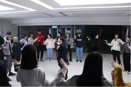 黑马营成员们围成一个大大的圈,左手扮乌鸦和右手扮乌龟,营长耿妈给大家讲了一个武体乌龟和乌鸦的故事,当乌鸦出现,左手逃,右手抓。同学的一惊一动都引起了哄堂大笑,活跃的气氛顿时从大厅散开。