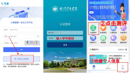 统一身份认证 --- 输入学号和密码进入 --- (第一次需要绑定手机号以及完善个人信息)--- 主页中点击心理测评 --- 完成测评问卷。